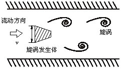 在測(cè)量管中垂直插入一個(gè)柱狀物時(shí),流體通過柱狀物兩側(cè)就交替地產(chǎn)生有規(guī)則的旋渦(如圖所示),這種旋渦列被稱為卡門渦街。卡門渦街的釋放頻率與流體的流動(dòng)速度及柱狀物的寬度有關(guān),可用下式表示: |
