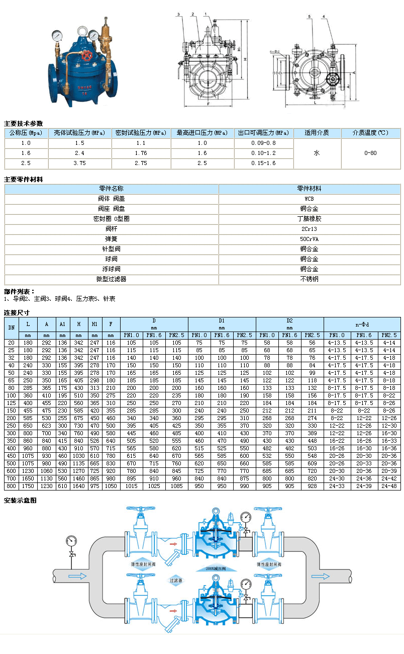 200X減壓穩(wěn)壓閥由主閥、導(dǎo)閥、針閥、球閥、微型過濾器和壓力表組成水力控制接管系統(tǒng)。使用時,當(dāng)調(diào)定出口壓力后,能自動保持穩(wěn)定出口壓力。本產(chǎn)品利用導(dǎo)閥自力控制,不需要其它裝置和能源,保養(yǎng)簡便,壓力控制準(zhǔn)確度高,受進(jìn)口壓力和流量影響小,減壓穩(wěn)壓可靠。本系列閥門產(chǎn)品廣泛用于高層建筑、生活區(qū)等供水管網(wǎng)系統(tǒng)及城市供水工程。當(dāng)閥門從進(jìn)口端給水時,水流過針閥進(jìn)入主閥控制室,出口壓力通過導(dǎo)管作用到導(dǎo)閥上。當(dāng)出口壓力高于導(dǎo)閥彈簧設(shè)定值時,導(dǎo)閥關(guān)閉。控制室停止排水,此時主閥控制室內(nèi)壓力升高并關(guān)閉主閥,出口壓力不再升高。當(dāng)閥門出口壓力降到導(dǎo)閥彈簧設(shè)定壓力時,導(dǎo)閥開啟,控制室向下游排水。由于導(dǎo)閥系統(tǒng)排水量大于針閥的進(jìn)水量,主閥控制室壓力下降。進(jìn)口壓力使主閥開啟。在穩(wěn)定狀態(tài)下,控制室進(jìn)水、排水相同,主閥開度不變,出口壓力穩(wěn)定。調(diào)節(jié)導(dǎo)閥彈簧即可設(shè)定出口壓力。 |