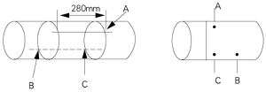 | 將定位紙纏繞在已表面清理干凈的管道上,注意要把紙兩邊互相重合對(duì)齊,才能使所劃的線與管軸相平行; |