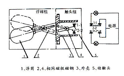 當(dāng)被測液位升高或降低時(shí),浮球1隨之升降,使其端部的磁鋼2上、下擺動(dòng),通過磁力作用,推斥安裝在外殼3內(nèi)相同磁極的磁鋼4上、下擺動(dòng),其另一端的動(dòng)觸點(diǎn)5便在靜觸頭1-1及2-2間連通或斷開。