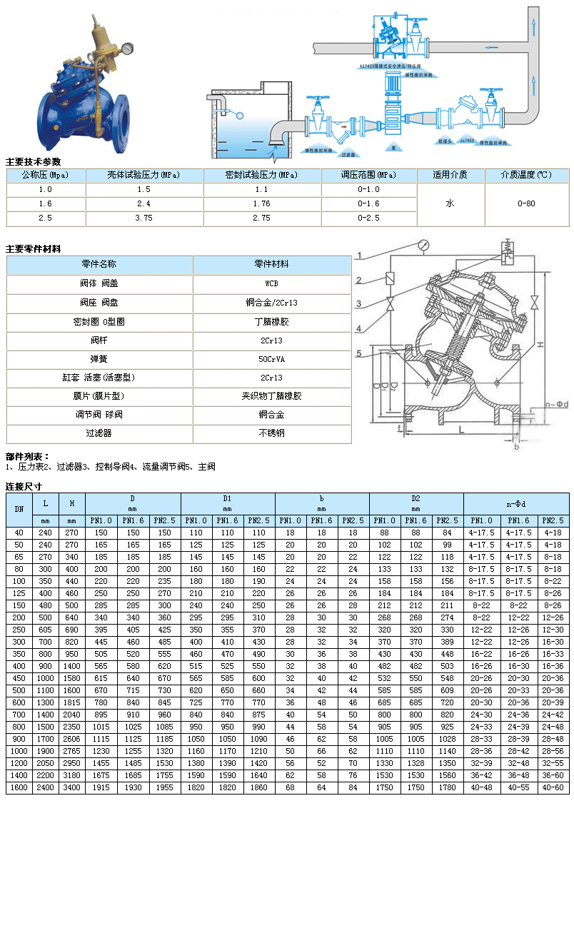 工作特點1、壓力控制穩定可靠。導閥、主閥連續工作,下游壓力變化連續、平穩,受進口壓力影響小。2、操作方便。工作壓力調定后,當上游壓力或流量變動時主閥自動調節,穩定了下游壓力。3、閥體采用了全通道、直流式、流線型設計。水力損失小,節能效果好。