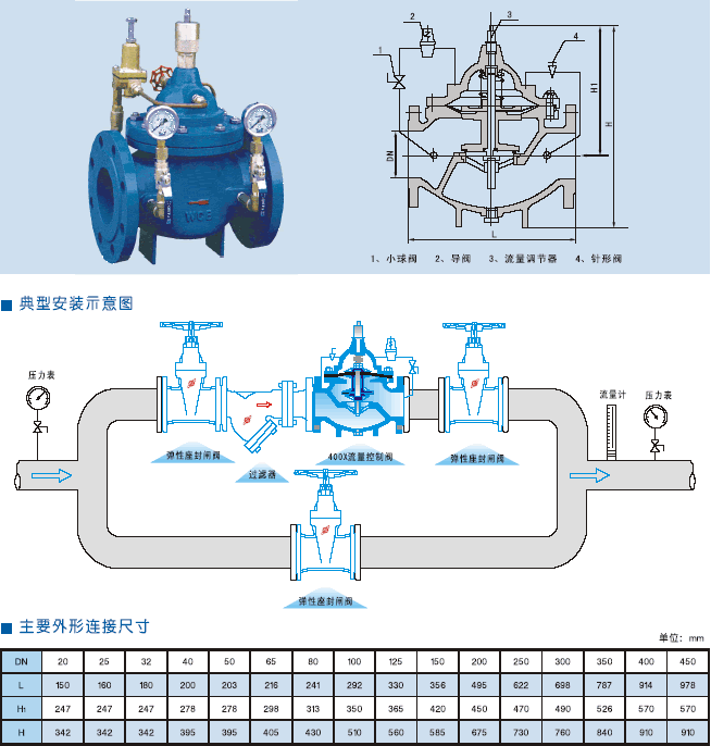 400X流量控制閥,是一種采用高精度先導式方式控制流量的多功能閥門。適用于配水管需控制流量和壓力的管道中,保持預定流量不變,將過大流量限制在一個預定直,并將上游高壓適當減低,即使主閥上游的壓力發生變化,也不會影響主閥下游的流量。該閥一改常規節流閥使用孔板或純機械地減小流域面積的原理,利用相關導閥,大限度地減少能力在節流過程中的損失。如遇緊急情況400X流量控制閥可以完全截止流量,避免損失。控制靈免度高,安全可靠,調試簡便,使用壽命長。