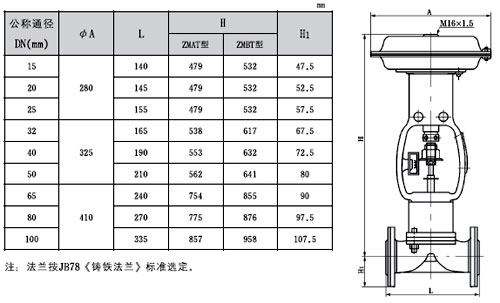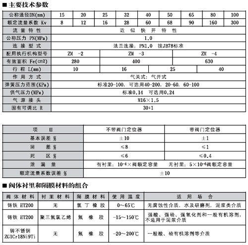 ZMA(B)T一10氣動(dòng)薄膜隔膜調(diào)節(jié)閥為無填料函結(jié)構(gòu)、節(jié)流元件為彈性隔膜,閥體流道平滑;閥體襯里和隔膜均可采用耐腐蝕材料制造,適用于控制各種腐蝕性和懸浮液介質(zhì)的調(diào)節(jié)場合。